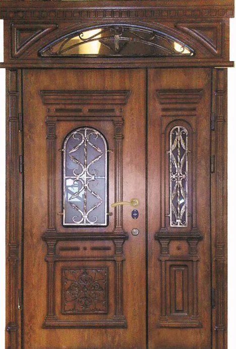 Поскольку в большинстве случаев устанавливаемые на входе в коттедж двустворчатые двери являются еще и предметом интерьера, украшающим здание, их дизайну предается особое значение. Эти двери, как правило, отделываются атмосферостойким МДФ, натуральным шпоном, массивом. Эффектно на таких дверях смотрится витражный узор, применение ковки, зеркальных элементов. Вариантов декора входной двустворчатой двери масса, тут все зависит от пожеланий заказчика.